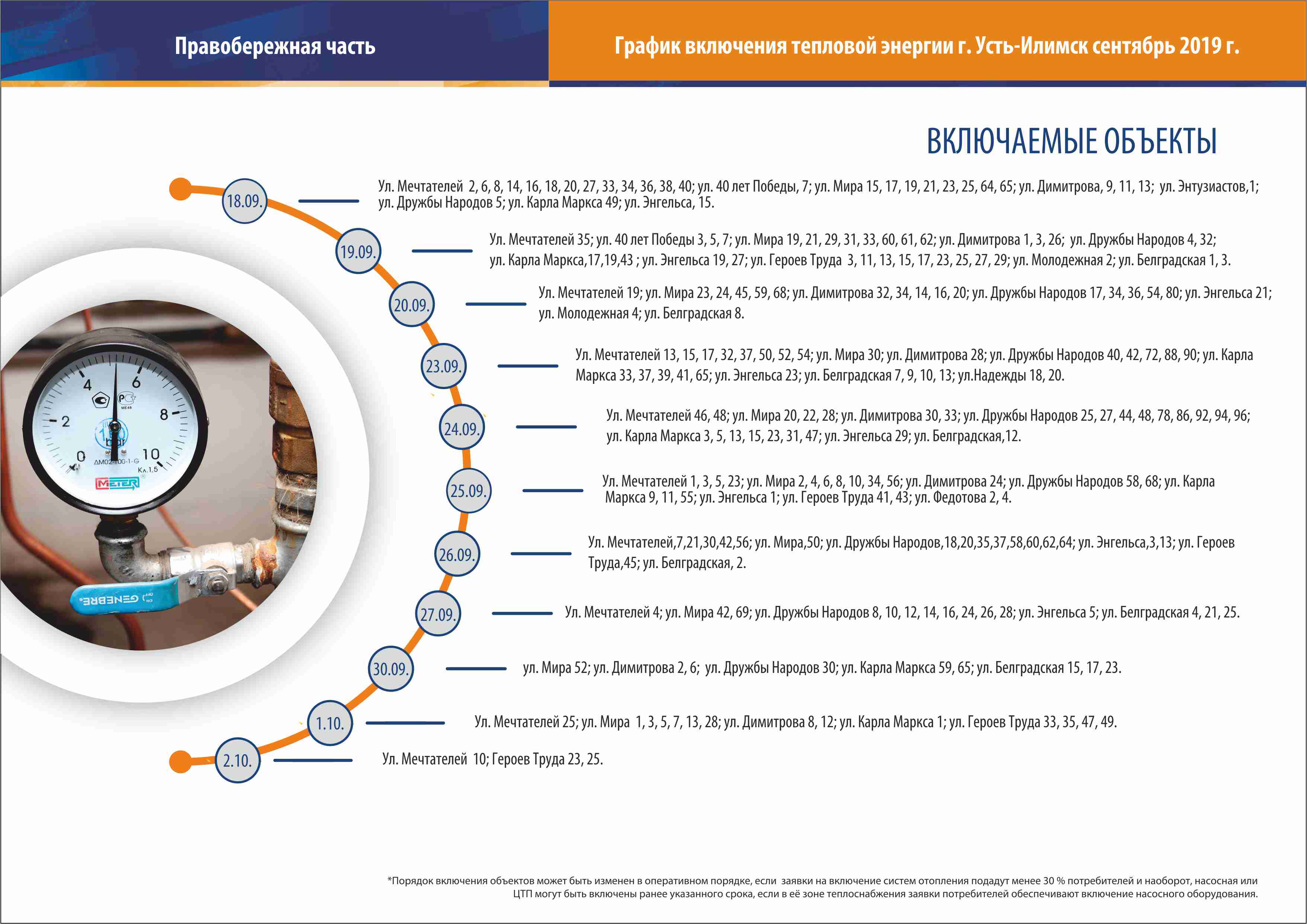 В Усть-Илимске начался отопительный сезон. В инфографике представлена по районам готовность тепловых сетей к подаче тепла в дома города, первый день – это 18 сентября.