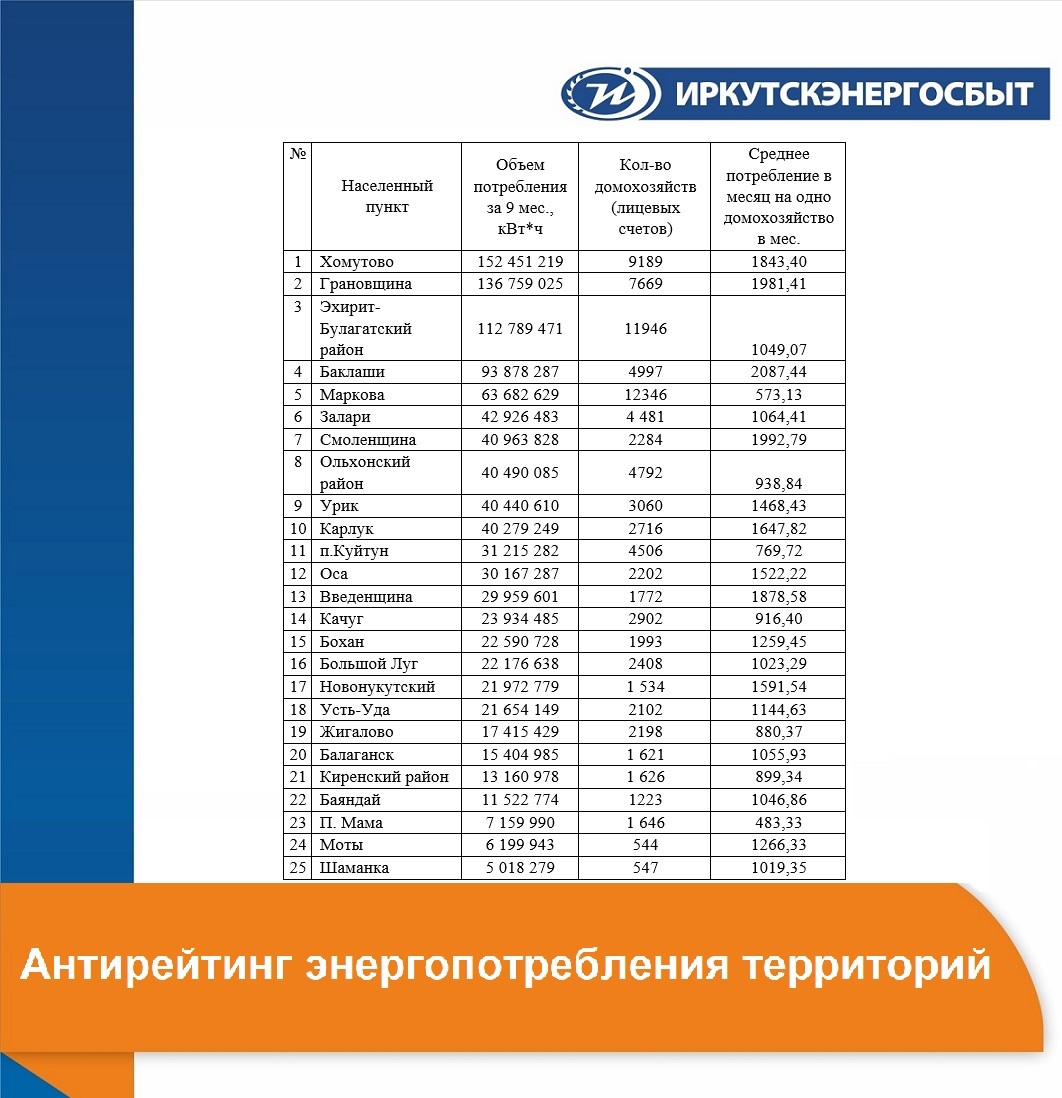 На первом месте с наибольшим объемом энергопотребления находится поселок Хомутово, потребивший более 152 млн кВт*ч. Такого объема электроэнергии хватило бы, чтобы целый год обеспечивать электричеством примерно 1500 многоквартирных домов. А поселку Хомутово, где таких домов почти нет, хватило этого объема энергии на 9 месяцев. Каждый потребитель здесь в среднем использует 1843 кВт*ч в месяц! Для сравнения, например, в Ангарске эта цифра в 8 раз меньше – 216 кВт*ч.